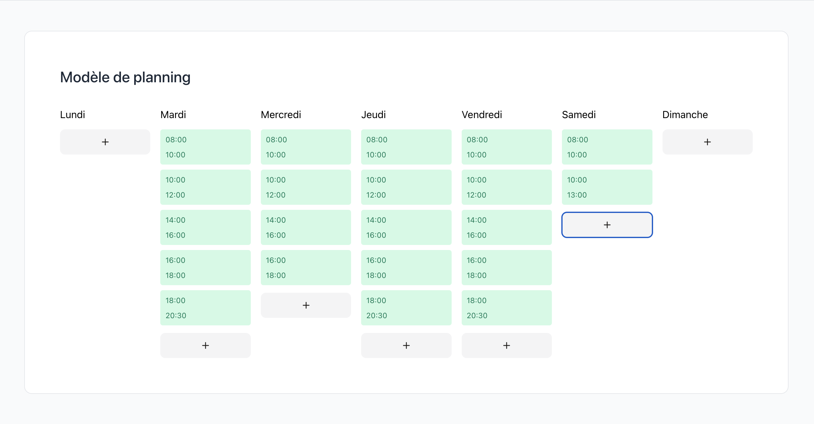 Remplissez votre modèle de planning et appliquez-le à la période souhaitée. Vous pouvez ensuite ajouter ou supprimer des créneaux à votre convenance.